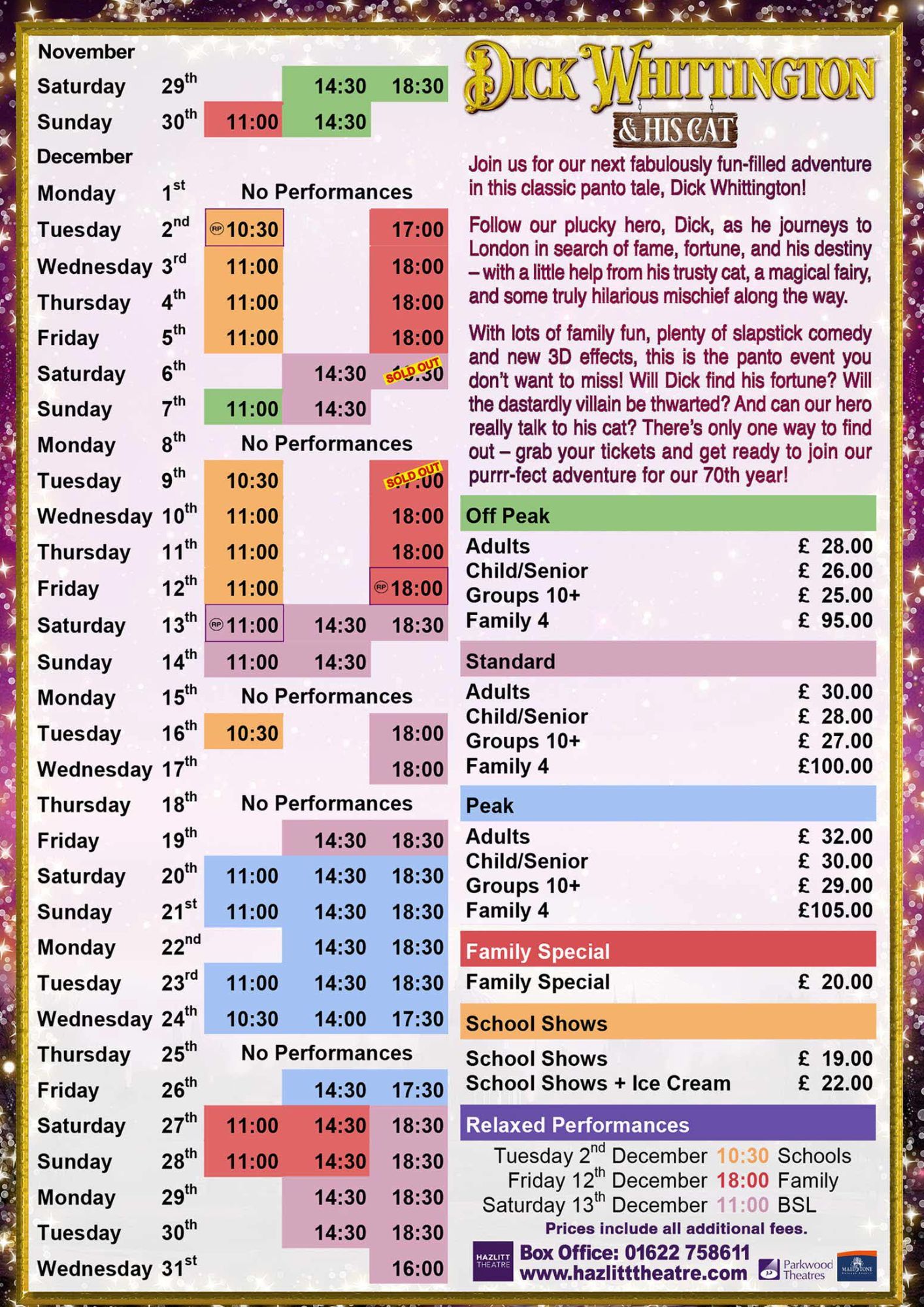 If you book for the following school dates you automatically receive our £20 group rate. Groups 10+ can only book through our box office 10.30am - 2.30pm, Monday - Saturday in person or over the phone on 01622 758 611 or email hazlitt.boxoffice@parkwoodtheatres.co.uk with any booking queries: